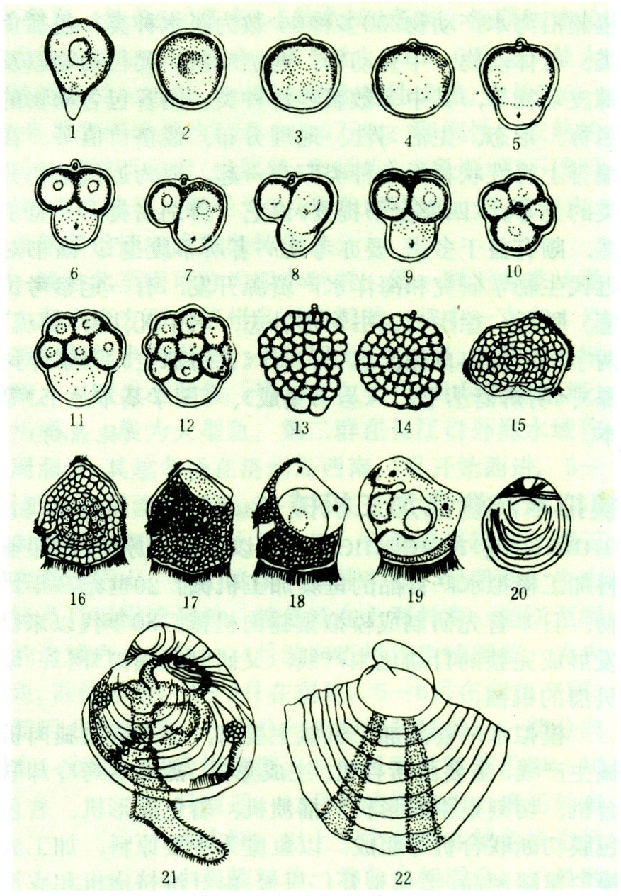 牡蛎发生后一年性成熟。繁殖期因种类而异;同种牡蛎由于所处海区条件不同繁殖期也有差异。即使在同一海区的同种牡蛎,每年的繁殖期也会因环境因子的变化而提前或延后。牡蛎的繁殖期在春末或夏季,繁殖盛期因种类而异,大连湾牡蛎在辽宁沿海为6月底至7月中;褶牡蛎在山东青岛沿海为7~8月;近江牡蛎在广东沿海为6~7月。大多出现在水温上升至最高点前后而盐度又是全年最低的月份里。在整个繁殖期内集中排放精、卵数次,每次持续两三天。急剧的温度、盐度变化可诱发产卵、排精。产卵量按种类、个体大小、栖息环境、分布密度不同而有差异,一般在数百万粒至1亿粒左右。幼虫发生与变态固着见图3。