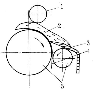 去除鱼片上鱼皮的鱼类处理机械。主要有滚筒式和冻结式两类。滚筒式去皮机由输送带、齿槽滚筒和带有弧形缺口刀刃的固定刀具等组成(见图)。操作时,将鱼片放入输送带送往主滚筒,鱼片上面用塑料辊压住,尾端被滚筒表面的齿槽强制地轧入滚筒间,固定刀具楔入鱼皮层,使鱼肉与鱼皮分离。冻结式去皮机由低温滚筒、输送带、切割刀具和制冷装置组成。操作时,输送带将鱼片送至低温滚筒,鱼皮表层迅速冻结而粘在滚筒上,刀具楔入鱼皮层连续切割,将鱼肉分离。粘在滚筒上的鱼皮用刮刀清除。这种去皮机需装一套制冷装置,使滚筒的表层温度降低到足以冻结的低温。机器的结构虽较复杂,但运转平稳,无噪声。