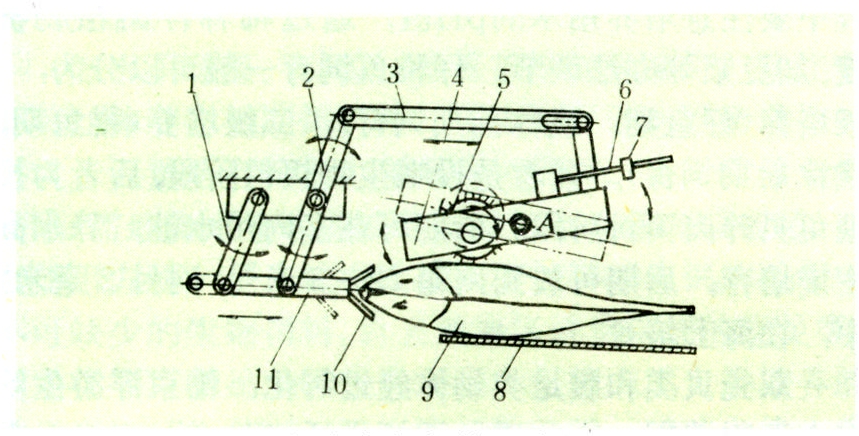 利用转动圆片刀切除鱼头的鱼类处理机械。适用于大型鱼的去头机有两类:一类是直切式。去头机的转动圆片刀系垂直装置,从胸鳍后直切,将鱼头连同鳃及锁骨一起切去,颈部鱼肉损失较多;另一类是V形切割,去头机的两片转动圆片刀装成V形,从鱼的颈部和背部切入鱼头,鱼肉损失少;还有一种V形切割,切割时鱼体转动,刀具绕着鱼头切割,将锁骨留在鱼体上,鱼肉损失最少。适用于小型鱼的切头是由装在去内脏机或鱼片机上的去头机构执行。去头机是一对相对转动的圆片刀构成刀具垂直或V形装置,对鱼头进行直切或V形切割。为了减少鱼肉的损耗,在切头刀具前常装有鱼头定位机构(见图),使鱼进入刀具切割前自动调整鱼头切割装置,刀具恰好在鱼的颈部切割。鱼头定位机构是根据鱼头厚度与鱼头长度变化的比例,通过机械装置调整切割部位,鱼经过鱼头定位机械的厚度测量杠杆时,测量杠杆的左端被抬起,其右端通过一组连杆机构变动鱼头夹具的位置。然后,测量杠杆后面的转动圆盘刷将鱼体推向已定位的鱼头夹,由一对相对转动的圆片刀切下鱼头。