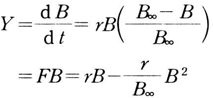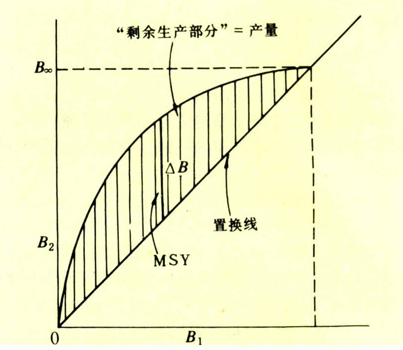 当种群生物量处于极低(B0)或者达到最高水平(B=B∞)时,△B为零;当B为中等大小时,△B达到最大值(图1)。因此,格雷厄姆(M.Graham,1935、1938)在种群增长的逻辑斯谛方程(见种群增长逻辑斯谛曲线)的基础上提出:假如渔业捕捞种群剩余生产部分的速率等于种群的自然增长率,种群大小将保持稳定