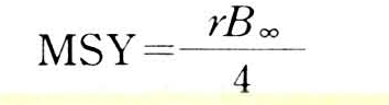 上式表明:在平衡状态下,种群的自然增长率(或称剩余生产部分的变化率)直接与种群的生物量以及实际生物量与种群最大生物量的差额有关;持续产量与种群平衡生物量之间为抛物线关系;种群的最大增长率,即最大剩余产量,出现在种群大小为B∞的一半时。相应地,最大持续产量(MSY)为: