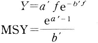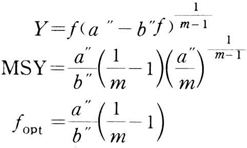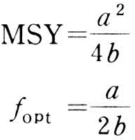 式中 a、b为参数。最大持续产量和最适捕捞努力量(fopt)分别为: