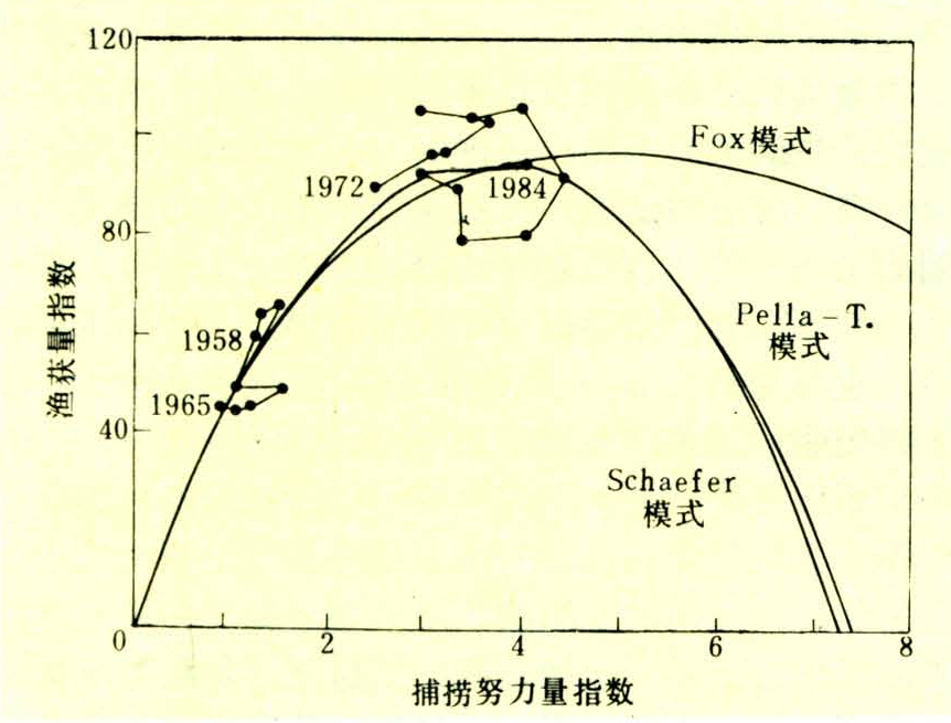 50年代以来,舍佛(M.Schaefer)、佩拉—汤姆林森(J.Pella;P.Tomlinson)和福克斯(W.Fox)等人,在捕捞死亡F为捕捞努力量f的函数(F=qf)的假设基础上,进一步完善了模式理论推导和参数的计算方法,提出了一些数学形式不同的剩余产量模式,主要有以下几种。