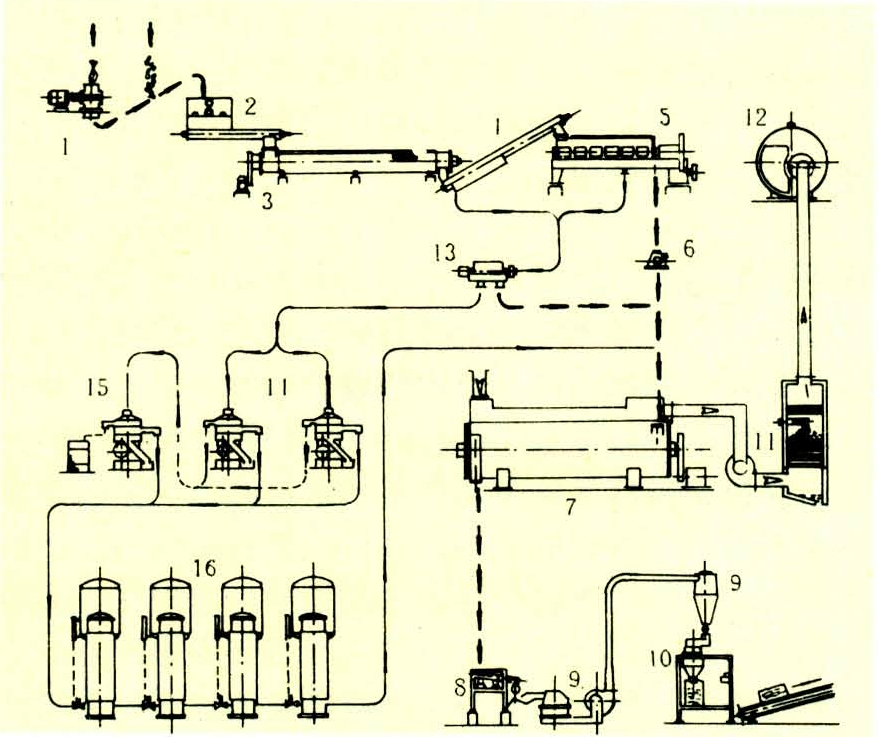 用结构紧凑的卧式螺旋卸料沉降离心机取代压榨机,分离的鱼汁十分澄清,无需除渣便可直接送往油水分离机,可省去数台机械设备。它采用燃油热风炉的烟道气间接加热。烟道气在干燥机入口处温度约为 400℃,干燥机内壁温度约160℃,而物料温度仅70℃左右,成品质量好。部分烟道气循环使用,热经济性较好。