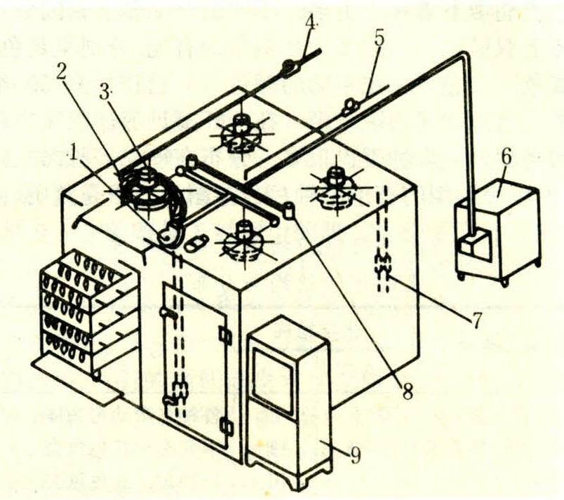 自动间歇式熏制设备(见图)由加热器提供热空气,并通过风机强制循环;由熏烟发生器提供熏烟对鱼进行熏制。能自动调节熏室内的温度、湿度、烟量,并控制熏制品的中心温度。还有一种电熏式装置。将鱼挂在熏室内平行的两根导线上,导线分别为正负极,通以高电压。熏烟借助于放电作用,迅速附着于鱼体。