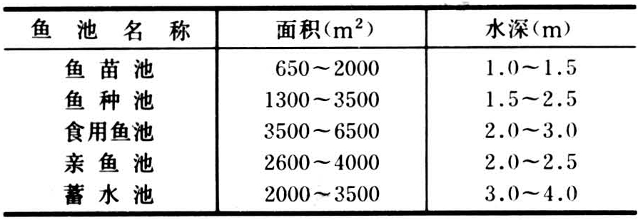 各种鱼池的规格,须按照鱼类不同生长时期的生活习性和各地区的气候以及生产技术的要求而确定。尚无各地通用的标准。一般认为较为适合的尺度见下页表。