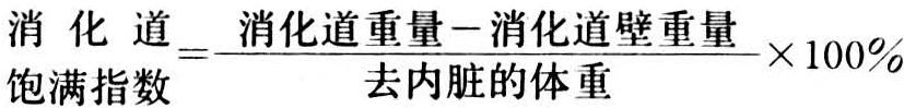 可采用消化道饱满度指数或饱满度等级来表示。饱满度等级一般把前肠(或胃)的饱满程度分为6个等级:0级——无食物;1级——食物占1/5;2级——食物占2/5;3级——食物占3/5;4级——食物占4/5;5级——充满食物。也可用下述公式表示: 鱼类摄食与消化 鱼类的摄食强度存在着季节、昼夜变化的节律性。
