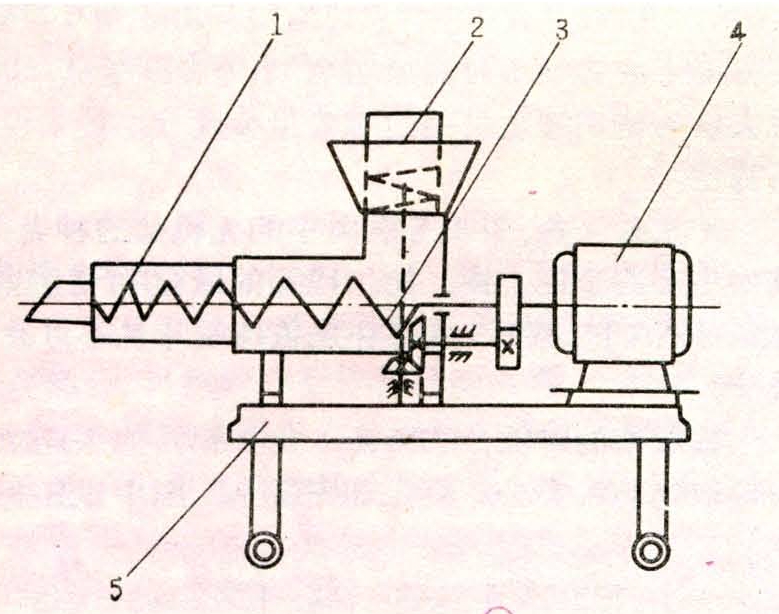剔除碎鱼肉中残存骨刺并将鱼肉细化的鱼糜加工机械。由带料斗的给料器、滤肉筒和螺旋送料器组成(见图)。给料器有螺旋刮板,可将料斗内的鱼肉向下压入滤肉筒后端的进料腔内。滤肉筒前部为圆柱形,筒壁有许多细孔。螺旋送料器安装在滤肉筒内,后段螺纹螺距较大,将进料腔内的鱼肉迅速向前推入滤肉筒内:前段螺纹螺距较小,螺纹外径沿轴向方向渐渐变短,故螺杆呈锥形,与滤肉筒前部相吻合。这样,每段螺纹间的体积逐渐缩小,对鱼肉形成挤压力,迫使鱼肉从滤肉筒的细孔中向外挤出,而留在滤肉筒内的骨刺仍被螺旋送料器继续推向前,从滤肉筒前端出口排出机外。在鱼肉与骨刺分离过程中,鱼肉因受挤压摩擦发热,影响鱼肉质量。新型鱼肉精滤机的螺旋送料器的转轴为空心管型轴,内通以循环冷却水冷却鱼肉。滤肉机的生产能力一般为500~3000千克/时。