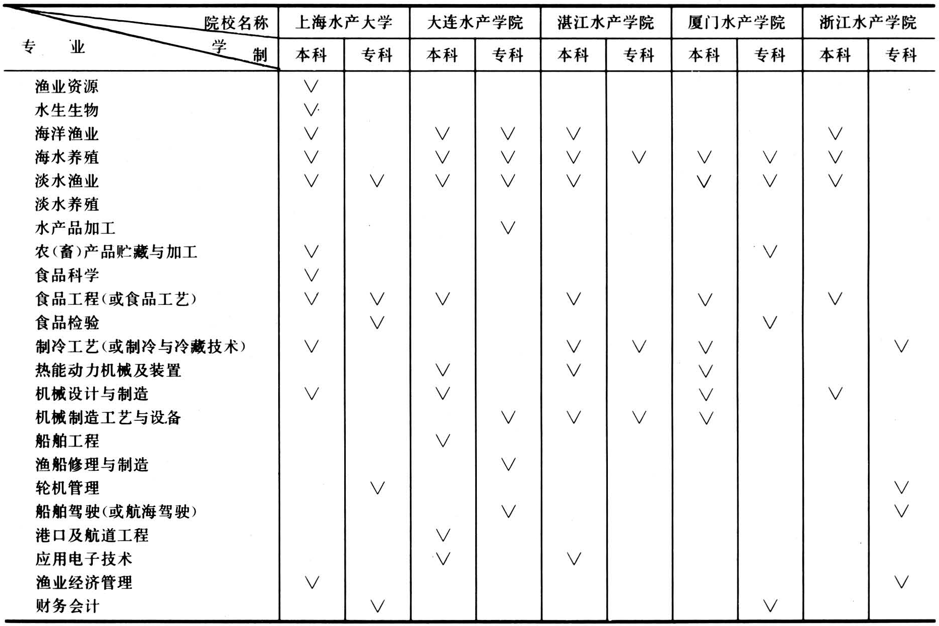高等水产院校担负着培养高级科学技术人材、发展水产科学技术和为高等及中等水产专业学校培养师资的任务。全国现有全日制高等水产院校5所,即:上海水产大学、大连水产学院、湛江水产学院、厦门水产学院和浙江水产学院。这5所院校的专业设置见下表。