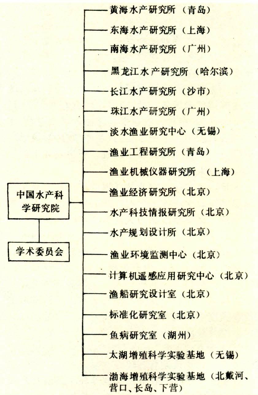 该院专业比较齐全,是人才相对密集的综合性水产科研机构。1978年于北京成立之初,原称中国水产科学研究设计院,当时仅有渔船、渔港、情报、标准化等研究设计所(室)的设置。1982年更名为中国水产科学研究院后,国家水产主管部门所属的海区水产研究所等直属该院管辖,同时为适应生产发展的需要,扩展研究领域,又相继发展了一些专业研究机构。至1987年,全院共有19个研究单位,形成了相对完整的综合水产科研建制(见中国水产科学研究院机构图)。研究范围覆盖了水产科学的7个分支,包括资源、环境、增殖、养殖、鱼病、饲料、捕捞、加工、保鲜、渔具、渔船、机械、仪器、工程、经济、情报、生物技术以及计算机和遥感应用等各个领域。1987年职工总数3295人,其中科技人员2056人,高级研究人员243人,分别占全国地区以上水产科研机构人数的32.4%、30.5%、64.9%。1978~1987年共有146项重要成果分别获得国家自然科学奖、发明奖、科技进步奖以及部委级各种奖励,占同期水产获奖成果的40.8%。