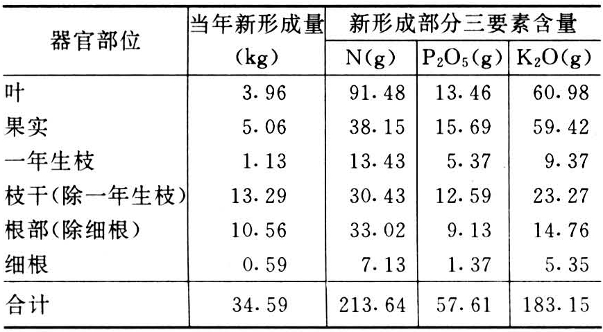 根据柿树在生长发育过程中对养分的需求,结合土壤供肥性能和肥料效应而采取的施肥技术。柿树是适应性很强的树种,土壤肥沃、养分供应充足,可以高产和优质,但土壤瘠薄也能维持一定的生长量和产量。在一般条件下,柿树吸收氮(N)和钾(K)肥б例较大,氮和钾在叶片、果实中较多(表)。柿吸收的氮(N)、磷(P2O5)、钾(K2O)的比例是1∶0.27∶0.86。
