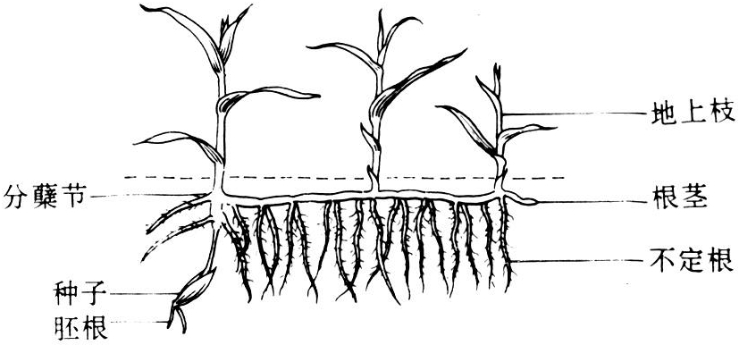 植物除地上茎外,从地下分蘖节长出与主枝垂直、平行于地面的地下横走茎,称之为根茎。根茎为若干节和节间组成,节上常具小而退化的鳞片状叶,叶腋处的腋芽向上长出垂直枝条,伸出地面后形成绿色的茎和叶,其节向下长出带有大量根毛的不定根。根茎分布于距地表5~10厘米处,在通气良好的土壤中可达20厘米。根茎短者长2~3厘米,长者可达100~150厘米,甚至几十米。节间长度与其直径成反比,根茎愈粗,节间愈短,分枝也少。常常后面部分死亡,先端顶芽继续生长并形成地上枝条。根茎寿命较长,禾本科植物的根茎生活2~3年,马兜铃科的欧细辛达8~12年,百合科的多花黄精达16~18年。根茎型草类具有很强的营养繁殖能力,当根茎部分腐烂或耙地切断后,每一根茎片段便成为一独立的繁殖体。每年从老根茎上长出新的根茎,新根茎上又产生新的地上枝条。根茎往往向周围辐射延伸,纵横交错,在一处形成连片的植被,但地面上为散生单株,不能掩蔽整个地面而形成草皮。根茎也是贮藏营养物质的器官,根茎型牧草返青与再生的营养物质主要来源于根茎贮藏的营养成分。对土壤通气条件敏感,当土壤空气缺乏时,分蘖节便逐年向上移动,以满足对空气的需求,土壤表层水分较少时移至一定深度根茎便死亡,故根茎型牧草在疏松、通气良好的土壤中生长良好。但芦苇等在土壤水分过多、通气不良的地区亦能生长,其叶片、茎和根茎具有气腔,空气从气孔进入,经气腔输送到根茎末端。在以根茎型牧草占优势的草地上放牧,土壤易踏实,结构被破坏,牧草产量降低。为了更好地利用这类草地,放牧时应注意土壤水分不要过多,持续放牧时间或载畜量要适度,一旦发生退化应立即松土改良。天然草地的根茎型草类有羊草、白茅、黄精、野牯草、沙鞭、大拂子茅、大油芒、寸草苔和黑穗苔草(图1)。