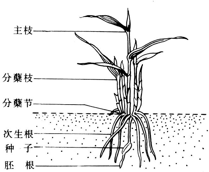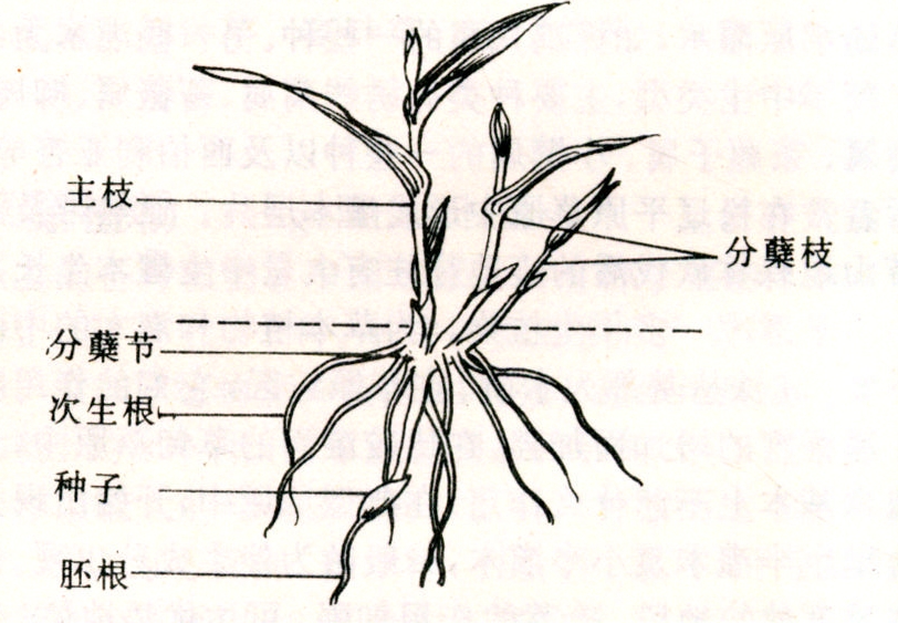 茎基部为若干缩短了节间的节组成的分蘖节区,节上具分蘖芽。分蘖节位于地表以下1~5厘米处,分蘖芽形成的侧枝与主枝成锐角,侧枝基部的分蘖节可产生次级分蘖枝条,与侧枝成锐角。能产生多级分蘖,各级分蘖枝条都形成各自的根系,地面上形成疏松的株丛。新枝条的形成每年是从边缘部分开始,株丛中部老枝死亡,根也随之死亡,年代较长的株丛中央地上部分常出现大量枯死枝条的残留物。株丛可掩蔽或不完全掩蔽地表,丛与丛之间缺少联系,能形成较好的生草土,但易破碎。分蘖节接近地表,对土壤空气的要求不严,土壤水分暂时过多的情况下能很好生长,在透性粘壤土、腐殖质土壤上生长最好。分蘖节不仅是形成新枝条的部位,也是越冬贮藏养分的器官。以疏丛型草类为主的草地放牧过重,家畜严重践踏丛间,使其下凹,形成很多小草丘,对草原及家畜都有害,载畜量不宜过高,水分过多时不宜放牧。可用耙清除草丛中央积累过多的有机残余,以刺激枝条向中央扩展。以疏丛型草类为主的草地适于刈割或刈牧兼用。很多野生疏丛型草已培育为栽培牧草。此类牧草有猫尾草、鸭茅、多年生黑麦草、披碱草和鹅观草(图2)。