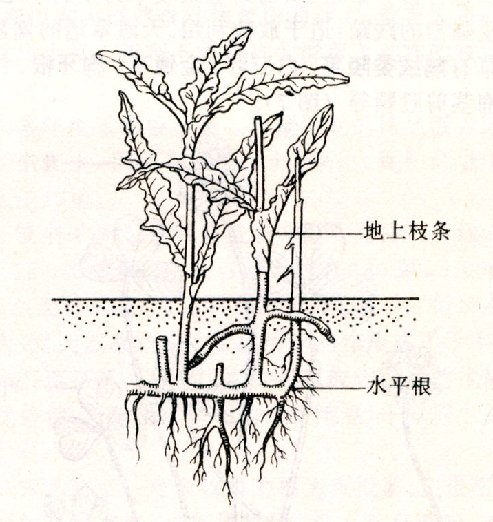具垂直短根,入土深15~100厘米,地面以下5~30厘米处,由垂直短根上生出水平根,上生不定芽,向上萌发生长到达地面形成枝条。水平根可长达4~5米,不定芽在夏秋或春季形成,分布在水平根先端,营养期末不定芽抵达土表而不出土,在地下越冬后翌年春天长出地面形成枝条。覆沙地上,随生长年限的增长,覆沙厚度增加,水平根入土渐深,埋入沙层中的根颈处可产生分蘖,发育成多层水平根。根蘖型草类繁殖力强,被切断的水平根可产生不定芽,形成地上枝条。草原上的甘草、柳穿鱼、苦荬菜、枪刀菜、黄芩和二裂委陵菜等属根蘖型牧草(图5)。
