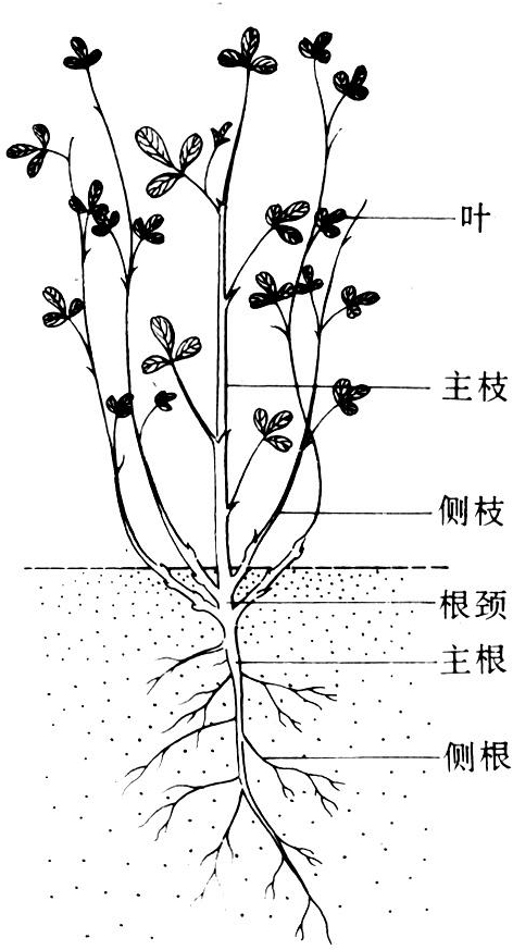 具垂直粗壮的主根,主根上长出许多粗细不一的侧根。入土深度一般从10厘米到200~300厘米或更深。茎基部在土壤表层下1~3厘米处与根融合在一起的加粗膨大部分为根颈,其上有许多更新芽,可发育成新生枝条,并以斜角方向向上生长。枝条上叶腋处具潜在芽,能发育为侧枝,侧枝可继续分枝。刈割和放牧后根颈上的更新芽和留在枝条上的潜在芽都可长出新生枝条,越冬后根颈上新根的萌发使牧草返青。越冬营养物质主要贮藏在直根及根颈中。寿命较长,几年至几十年不等。在通气良好,土层较厚的土壤上发育最好。草原上属此类牧草的有冷蒿、线叶菊、蓍状亚菊、歪头菜、盐爪爪、草云香和阿尔泰狗娃花等(图6)。