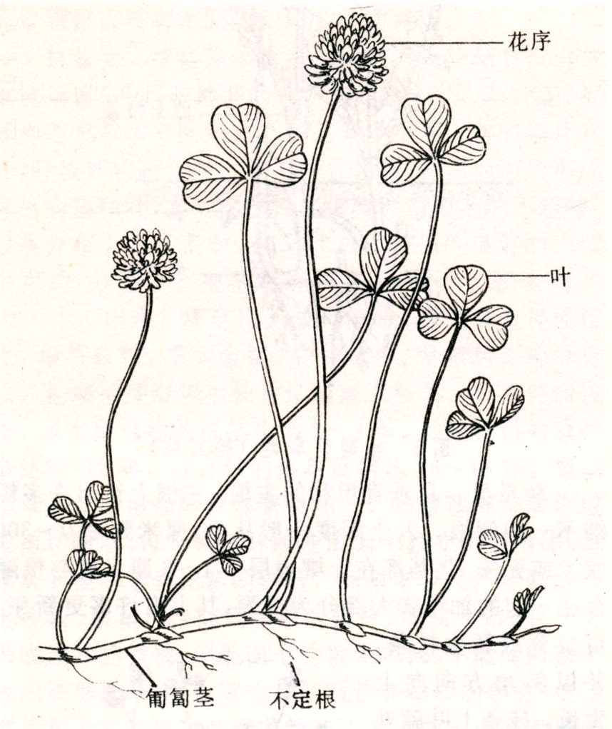 由母株根颈、分蘖节或枝条的叶腋处向各个方向生出平匍于地面的匍匐茎。匍匐茎的节向下产生不定根,腋芽向上产生新生枝条或叶簇。老枝条、株丛或匍匐茎逐渐死亡,新枝条、株丛或匍匐茎继续产生新的匍匐茎。匍匐茎死亡后,节上产生的枝条或株丛可形成独立的新个体。繁殖能力强,带节的匍匐茎片段就可以进行营养繁殖。以匍匐茎型牧草为主的草地,能够经受强烈的践踏,适于放牧利用。天然草地的匍匐茎型牧草有鹅绒委陵菜、白三叶、金钱草、狗牙根、结缕草、匍茎剪股颖等(图7)。