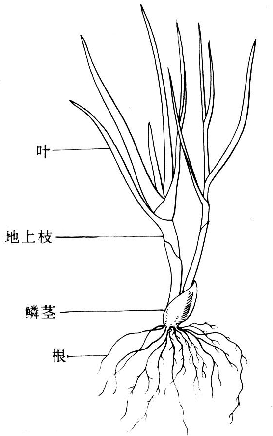 土壤中5~10厘米深处,由许多肉质叶包被缩短节间的茎(鳞茎盘),形成球形地下茎。是一种特殊的营养繁殖器官。贮藏养分的肉质叶有多种不同的形态,或生长在绿叶下部或特化为肉质茎生叶。上部叶腋处的腋芽发育为新枝条,肉质叶鞘间的腋芽活动可产生新的小鳞茎。鳞茎盘下部生有许多不定根,主根死亡早,主要靠茎出不定根吸收养分,这种根每年更新。鳞茎植物主要适应于干草原和半荒漠地区气候,尤其在高山草原及山地旱生植物群落中有大量分布。具大量以往死亡的枯叶鞘,保护处于较深土壤中的鳞茎,使更新芽渡过夏季干旱和冬季寒冷时期。生长于天然草地中的此类牧草主要是百合科的葱属、百合属和贝母属。其中以葱属的一些植物建群的草地在东北、内蒙古和青藏高原部分地区有一定的饲用价值,可作为家畜秋季催肥的主要草场(图8)。(韩建国)