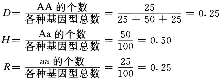 基因型频率的计算:例如A和a一对等位基因所组成的三种基因型的数目为:AA25个、Aa50个、aa25个。它们的频率分别用D、H和R表示,则: