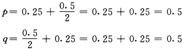 以上两式是基因型频率和基因频率间的一般关系式。只要知道各种基因型的频率,就可计算出基因频率。假设已知D=0.25,H=0.5,R=0.25,直接代入上式,得:
