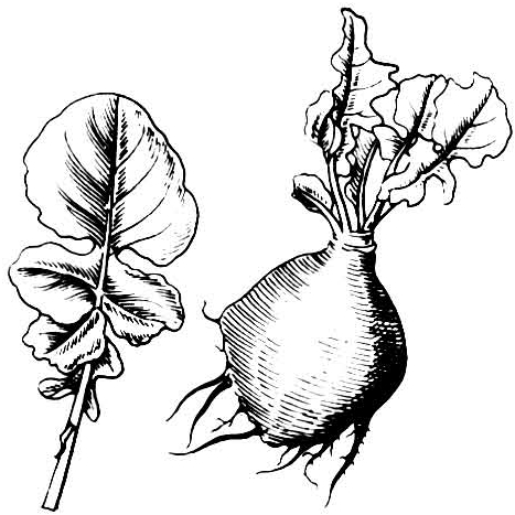 肉质根肥大,圆形或纺锤形,地上部为浅绿或浅紫红色,地下部为白色。根肉为白色或黄色。根颈部短缩茎略伸长,花茎自顶端抽出,高50~90厘米,花冠黄色。果实为长角果,含种子5~15粒,圆形,黑褐色或灰褐色(图)。千粒重3.2克。