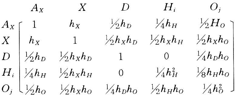 矩阵中 hX、hD、hH和hO分别为X、D、H和O的遗传力的平方根;i=1,2,…,m;j=1,2,…,n。计算hX、hD、hH和hO的公式是: