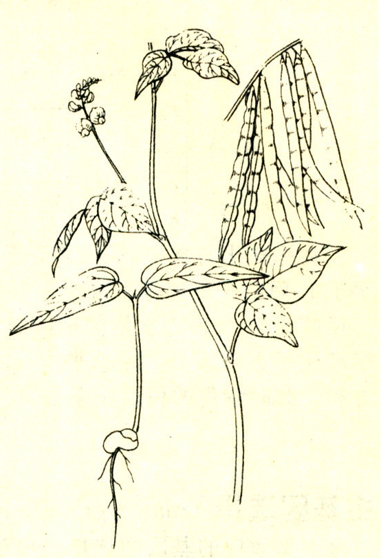 形态特征 主根明显,侧根分布于表土层。茎蔓长2~3米,有沟槽,被短白毛。三出复叶,小叶卵圆形,先端渐尖。托叶较大,深裂。腋生总状花序,花黄色,2~3朵花簇生于1节,每花序梗5~20朵花。荚果细长,圆筒形,褐色,成熟易开裂。每荚6~12粒,种子圆柱形,种脐白色中间凹入。种皮光滑有黄、红、绿、褐色或有斑点(图)。千粒重45~80克。染色体数2n=22。