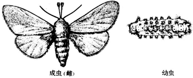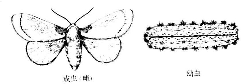 ,成虫体长14毫米,翅展38毫米,灰黑色有金属光泽。下唇须甚长,并向先端逐渐增粗,先端鳞毛长,黑色,呈扇形,前伸远远超越额部。菌翅狭长,外缘强度内斜。足短而粗壮,腿、胫、跗节外侧生有灰黑色长鳞毛,后足胫节有内距和端距各1对。腹部橙黄色,每节后缘均生黑色鳞毛,末节黑色,尾毛橙黄色。幼虫体长26毫米,圆柱形,第2、3、4节宽大,第3、4、7、8对亚背枝刺和第2气门上线枝刺最大。体后两节侧各有一对黑色毛簇,为4点状。体黄绿色,有时带桔红色,遍体分布着大小不一的椭圆形黑色点,故体呈锈状(图3)。