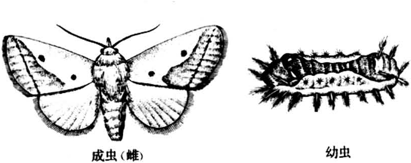 成虫体长14毫米,翅展34毫米。体黄色,颅顶鳞毛黄色直立,下唇须长且上举,超越头顶,其基部赤褐色,先端灰白色。前翅前半部黄色,近臀角处及中室上下各有一褐色斑,后半部褐色或淡褐色,并由顶角向后缘斜走着两条褐色线。后翅淡褐色,缘毛黑色。足基节桃红色,腿、胫节灰褐色并杂有黑毛,跗节灰色。后足胫节有内距和端距各一对。腹部红褐色。幼虫体长24毫米,黄绿色。第2、3、4、10体节大且隆起,第2、3、8对枝刺最大。背部有一个哑铃形赤褐或紫褐色大花斑(图2)。