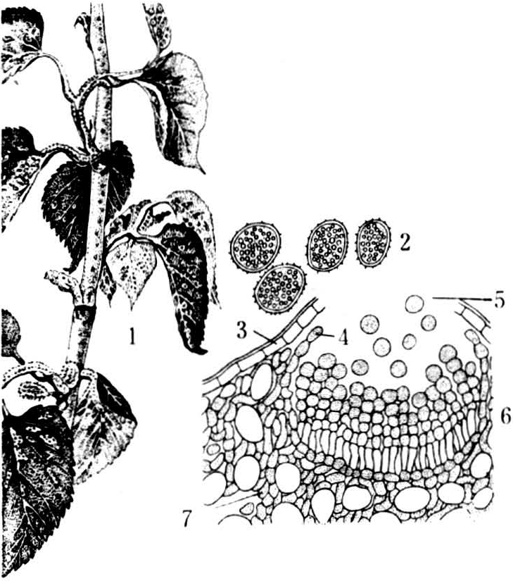 病原菌侵入桑树的幼芽、嫩叶、新梢以及花椹等绿色组织,发病后病芽局部肥厚,弯曲呈畸形,产生橙黄色病斑,生长停顿,变焦脱落。叶部受害时,病斑发生在正背两面,在叶面的多呈散发性点状病斑,在叶背的多沿叶脉蔓延呈网条状病斑。新梢上的病斑,初黄色椭圆形,后老化变暗褐色的坏死斑,凹陷,病斑部的木质变黑,易折损,常导致病斑部以上枝条产生枯梢现象。病斑上初时带有光泽透绿细小圆点,逐渐扩大隆起如小泡状(青泡),以后青泡变黄,突破表皮,产生橙黄色病斑(黄泡),从病斑上散出橙黄色粉状物后老化,变焦褐色(焦泡)。
