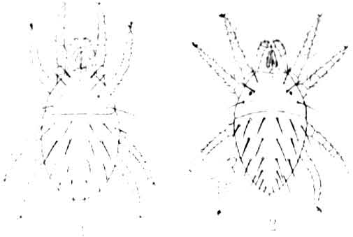 成虫体小型,橙黄色,雌虫长约0.4毫米,后部钝圆;雄虫长0.35毫米,后部瘦削。体躯分节不明显,背面隆起,腹面扁平,口器刺吸式。前体部背面有两对红色球状单眼和3对刚毛,后体部着生刚毛5横列。雌成虫分布为3、2、2、2、1对,共20根:雄成虫分布为3、2、2、2、2对,共22根。足4对,2对在前体部,伸向前方,2对在后体部,伸向后方。跗节端部有爪,雌成虫爪4分叉,雄成虫爪2分叉。卵球形,直径0.1毫米,初产时无色透明,后渐变为淡黄色。卵孵化后称幼虫,体圆形淡黄色,仅有足3对。幼虫蜕皮一次,即为若虫,体橙黄色,有足4对(图)。
