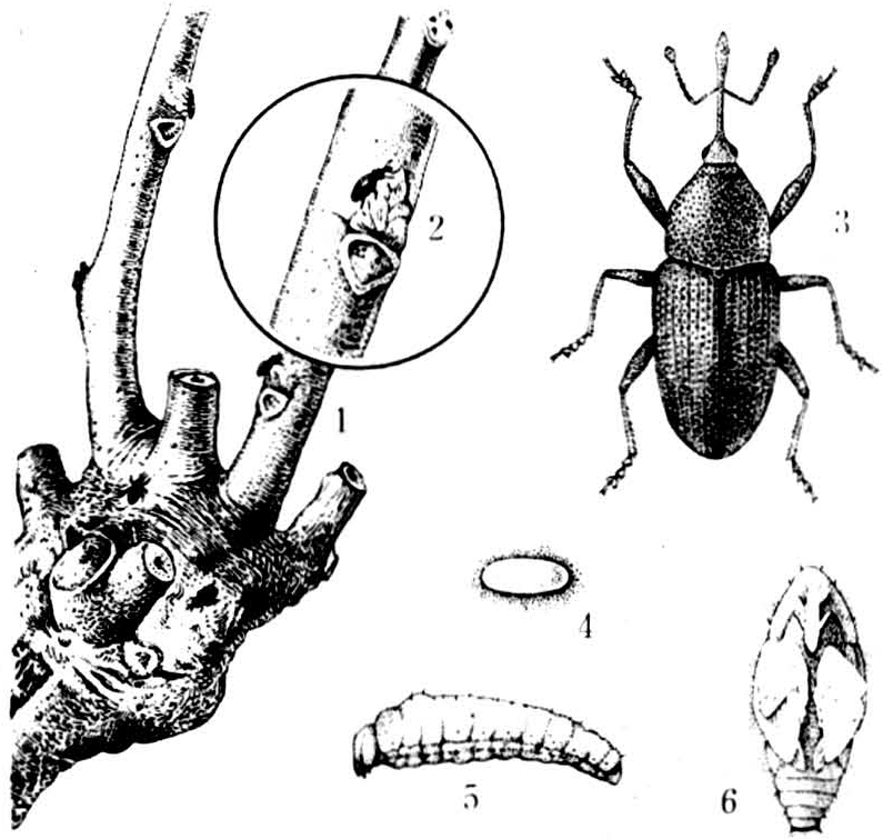 幼虫蠕虫型,体粗肥柔软,稍弯曲,长5.6~6.6毫米,初乳白色,老熟后淡黄色。蛹纺锤形,长4毫米,乳白色,羽化前黄褐色,腹末左右各具一小突起(图)。生活习性 桑象虫一年一代,多数以成虫在半截枝皮下的化蛹穴内越冬。每年3~4月越冬成虫从潜伏场所走出为害,5~6月产卵,一周左右孵化,经1一2月老熟,即蛀入木质部,营造椭圆形化蛹穴,化蛹其中。蛹经7~17天羽化后越冬。