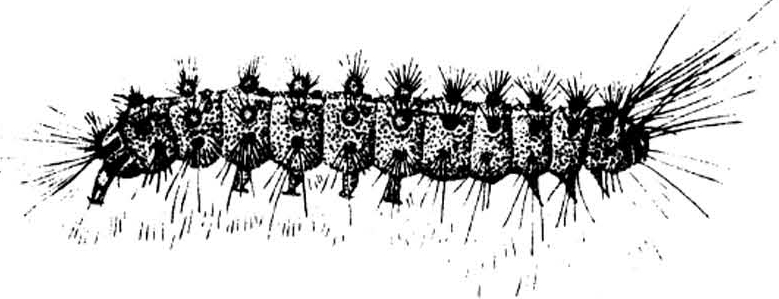 雌蛾淡白褐色,雄蛾灰褐色。翅展47~90毫米。前翅中室中央有一黑褐色点,横脉纹呈“<”形,翅面有波浪状横线,缘毛黑白相间。卵球形,两侧略扁。幼虫有毒毛,3龄前头部黑色或黑灰色,4龄后头部色泽转淡,有明显的八字斑纹,前5节体背毛瘤蓝色,后部各节毛瘤红色。老熟幼虫体长50~70毫米,头宽6毫米。蛹红褐色或黑褐色,体壁着生锈黄色毛丛(图1)。