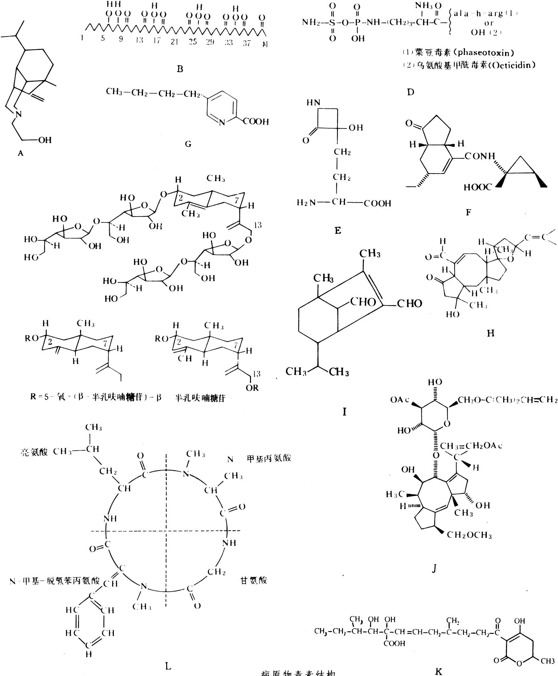 梨孢素由稻梨孢产生的一种含氮化合物,对植物的影响属半专化性。水稻感病品种的敏感性高于抗病品种。 病原物毒素结构 刺盘孢素由毛地黄炭疽病菌产生的一种多糖。交链孢酸由番茄、马铃薯早疫病菌产生的半醌衍生物(图K)。细链格孢素引起棉花和其他作物幼苗黄化的链格孢菌产生的一种环状四肽(图L)。