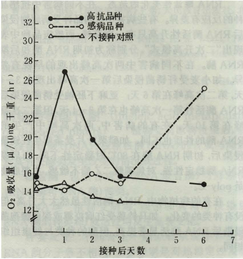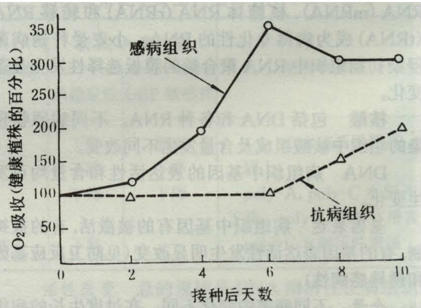 感病品种呼吸速率迅速升高的现象如烟草青枯病中,抗病品种C oker139的组织摄氧量在侵染后第8天上升为对照的150%,而感病品种Bottom Special第2天即开始升高,第6天升至对照的350%(图2)。
