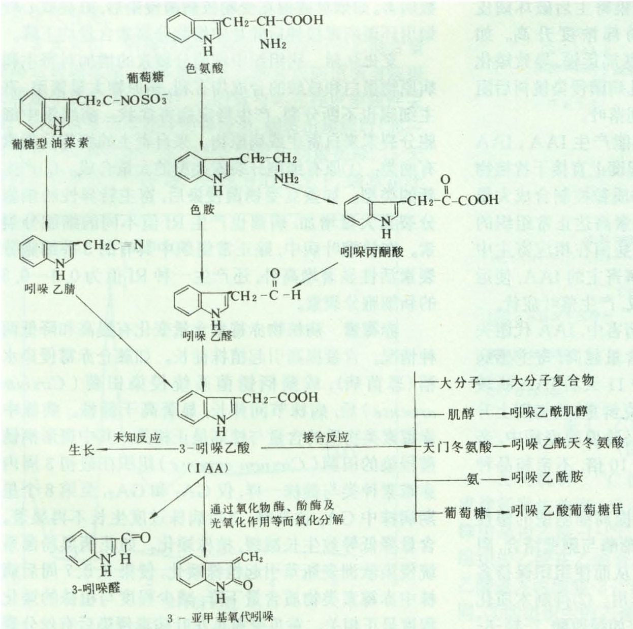图1 3-吲哚乙酸(IAA)的生物合成途径(仿Phelps和Sequeira)及其代谢作用(仿Galston和Davies)