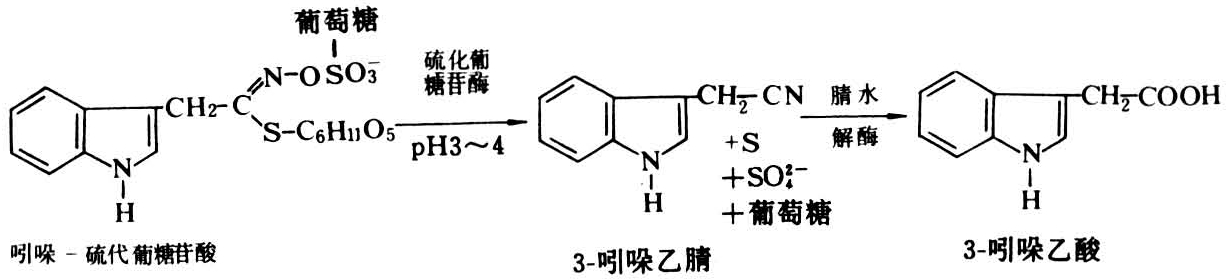 IAA在正常组织中以接合态而存在。病原物侵染后水解复合物使IAA变成游离态。如十字花科植物中含有芸薹葡糖苷及其水解酶β-硫化葡糖苷酶。被芸薹根肿菌侵染后,使酶与底物接合,芸薹葡糖苷水解成3-吲哚乙腈,葡糖硫酸,H2S和硫,再由腈水解酶将3-吲哚乙腈转变成IAA(图2)。