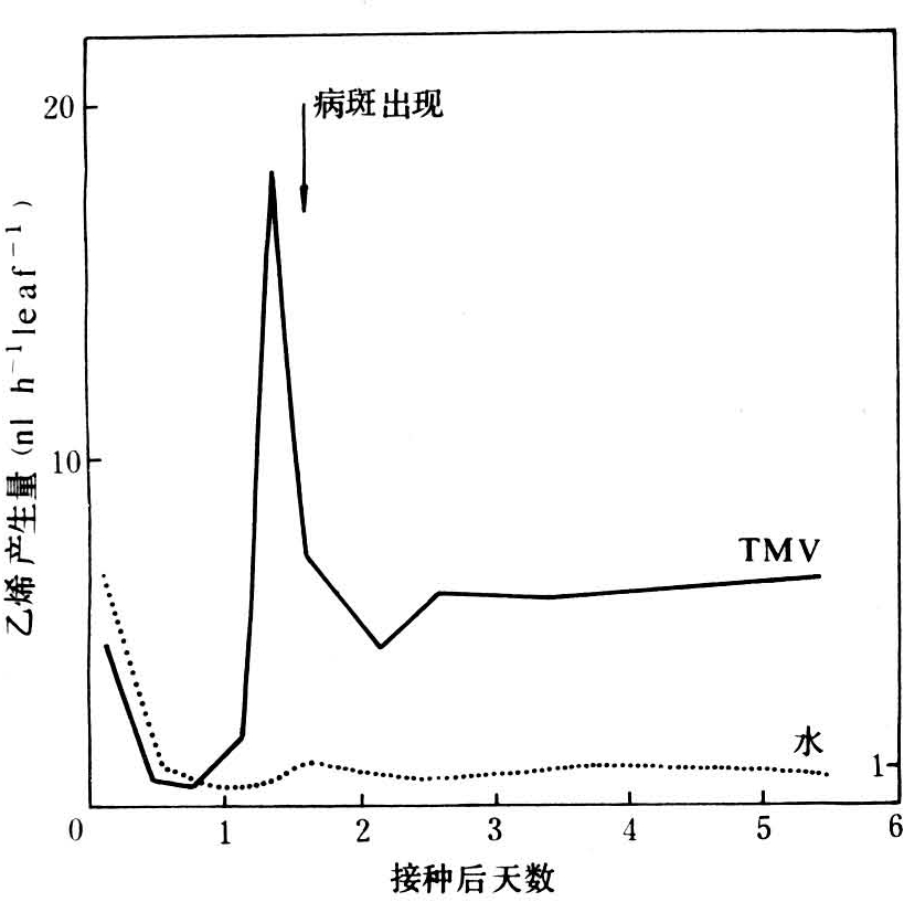 病毒侵染植物后导致组织中乙烯含量提高是普遍现象,大多情况下乙烯合成的速率与病斑发展速率正相关,乙烯产生的量与坏死程度呈线性关系。如烟草受烟草花叶病毒侵染,病斑出现前后(36~42小时)乙烯开始产生,3~5天后达到最高峰,15天后仍是对照的5~10倍。但也有的情况下,烟草花叶病毒接种三生NN烟后,组织中乙烯产生高峰出现在病斑产生之前(图3)。
