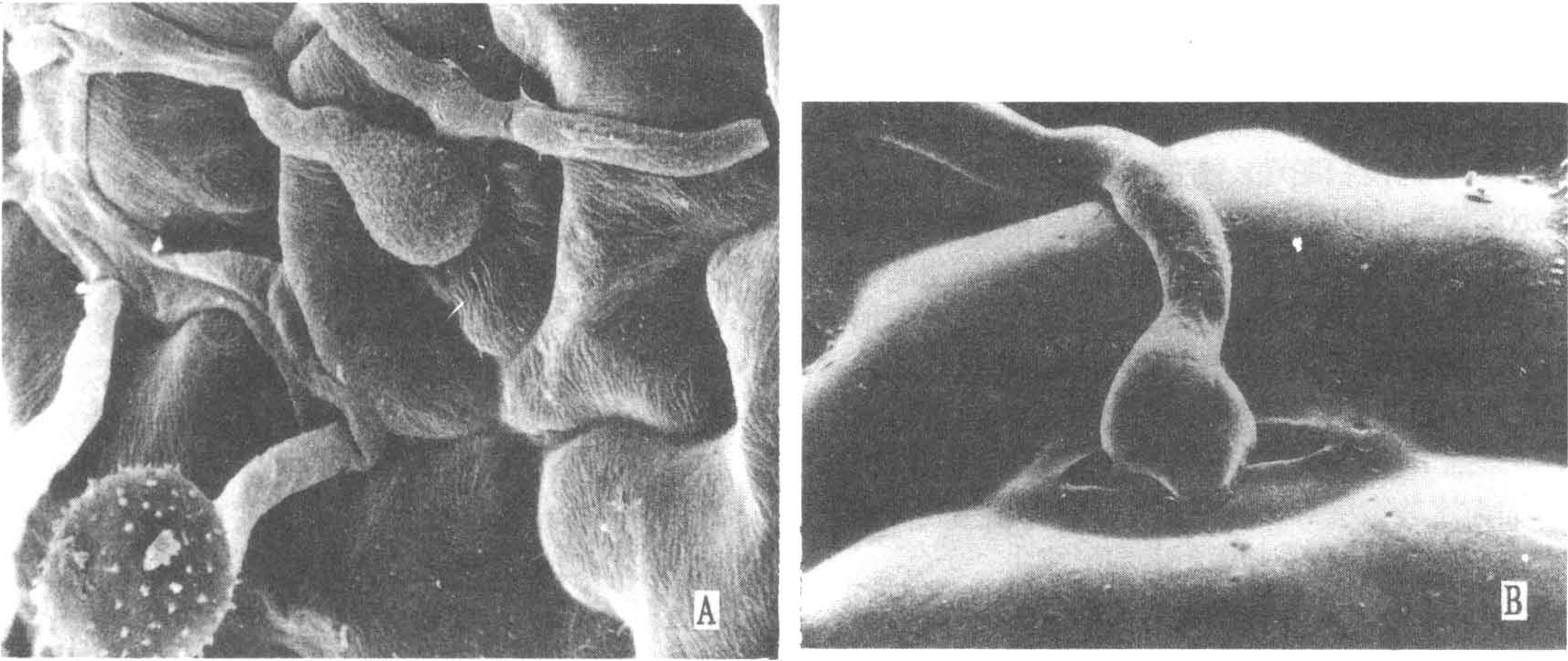 图1 菜豆锈病菌的芽管在寄主表面(A)及其人工模拟膜上(B)沿细胞的脊突结构朝向气孔生长,在气孔瓣上形成附着胞(仿R.N.Goodman)
