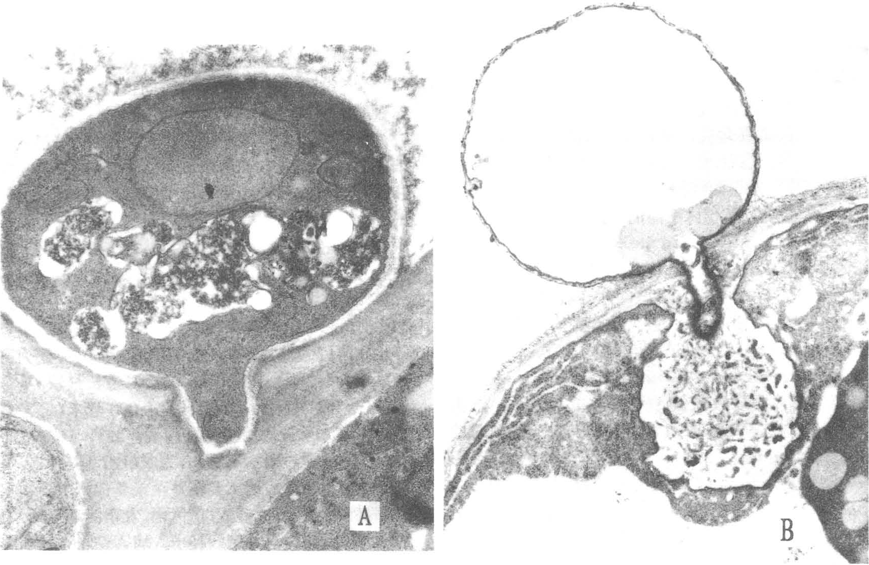 休眠机构萌发产生的芽管,或孢子囊释放的游动孢子到达植物表面并休止后产生的芽管,当从寄主自然孔口侵入时,通常要在寄主表面朝侵入部位定向生长,到达侵入部位后形成附着胞并产生侵入栓(丝)侵入寄主。这一过程受两种机制控制:①向性(tropism)。病原物受植物理化刺激而趋向植物某部位生长的特性。由植物化学因子的刺激引起的病原物向性(向化性,chemotripism),可以调节芽管的初期生长方向。如苹果黑星菌的芽管,可由寄主气孔分泌的维生素、生物碱、氨基酸等物质刺激而朝向气孔生长。当芽管继续生长并与寄主表面接触后,植物表面的特定结构刺激芽管保持定向生长(向触性,thigmotro-pism),直到发现侵入部位。有的真菌沿寄主细胞间隙生长,如大麦白粉菌;有的沿细胞脊突生长,如菜豆单胞锈病菌(图1)。②附着胞形成。植物表面结构特征的变化和某些化学物质可以中止芽管的生长,刺激附着胞形成。当菜豆锈病菌的芽管到达气孔瓣时,气孔瓣的柔软特征便发生这两种作用(图1,A、B)。在小麦锈病菌等病原真菌中,寄主表面的类脂化合物首先刺激孢子萌发并控制芽管的生长方向,当芽管到达气孔时,这类物质含量的变化使芽管停止生长,此时气孔分泌物中的锌离子刺激附着胞形成。