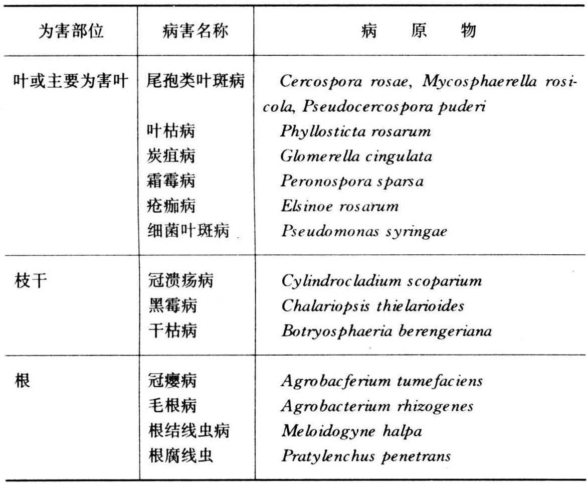 发生普遍。主要削弱生长,降低质量和产量,极少引起植株死亡。表现花叶、斑驳、脉带、矮化及萎蔫等症状。病原物多种,较常见的是蔷薇花叶病毒(Rose mosaic virus,RMV)和苹果花叶病毒(Apple mosaic virus,AMV),均为球状病毒,汁液传播。前者引起花叶、环斑、栎叶纹、矮化等,后者引起花叶和斑驳。其他还有南芥菜花叶病毒(Arabis mosaic virus,ArMV)、草莓潜隐环斑病毒(Strawberry la-tent ringspot virus,SLRSV)、李坏死环斑病毒(Prunus necrotic ringspot virus,PNRSV)、蔷薇萎蔫病毒(Rose wilt virus,RWV)、蔷薇条纹病毒(Rose streak virus,RSV)和烟草环斑病毒(Tobacco ring-spot virus,TRSV)等。病害控制主要采用无病接穗和砧木做繁殖材料;及时淘汰病株;必要时用热处理,在38℃下保持一个月,有良好效果。
