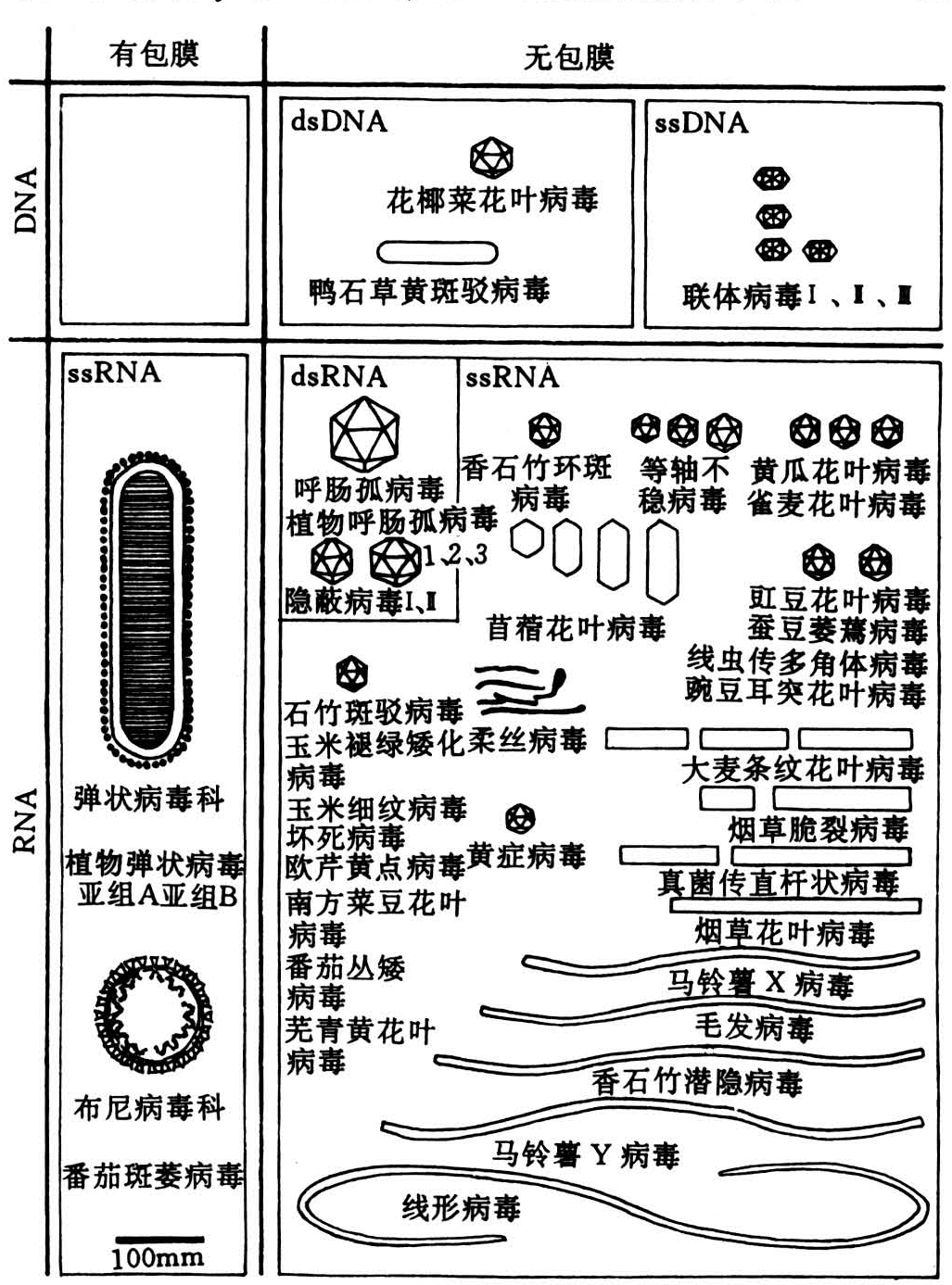 国际病毒分类委员会(International Committee on Toxonomy of Viruses,ICTV)第五次报告中(R.I.B.Francki;etal1991),将侵染脊椎动物、无脊椎动物、植物、藻类、原生动物、真菌和细菌的病毒编排为34个科,112个属或组,并附卫星和类病毒。其中植物病毒设32个组,既侵染植物也侵染动物或与动物病毒性状相似的植物病毒被编排在相关的动物病毒的三个科中。在3科和32个组(见图)中共包含已鉴定的709个植物病毒成员。