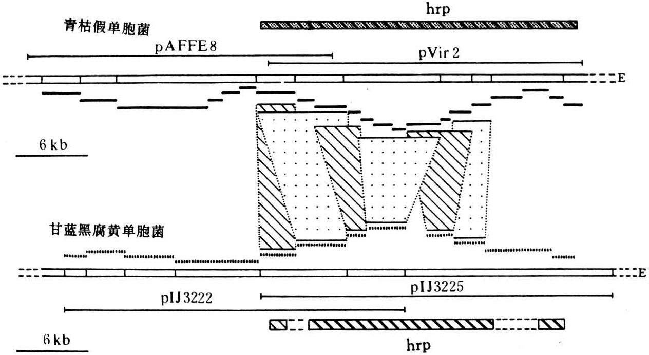 青枯病假单胞菌和油菜黄单胞菌油菜致病变种hrp基因区的结构同源性(黑点区和斜线区表示相互之间的同源区)(引自Arlat,M et al1991)