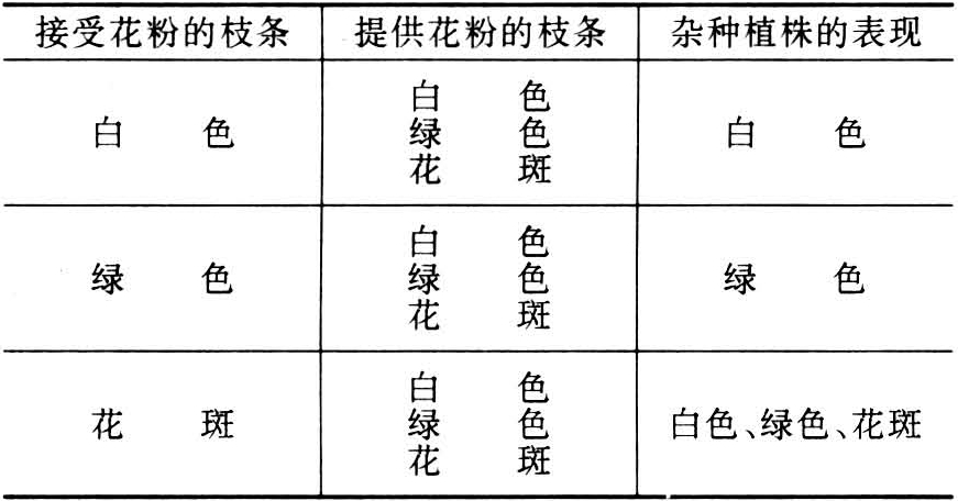 叶绿体蛋白质的合成,是不完全的自主性合成。首先,叶绿体蛋白质合成所需的有关酶类是受核基因控制的。因此,并非叶绿体都是由叶绿体自身DNA的编码复制的,而是通过叶绿体基因组和核基因组共同作用完成的。其次,在某些性状发育时,叶绿体DNA不能独立于核基因组之外而起作用。如天竺葵花斑叶的遗传,表现了核与质的共同作用(表2)。在玉米埃型条纹株的遗传分析中,可以看出核基因作用下稳定遗传的现象。有些不具叶绿体的白化植株,是一种隐性基因的遗传。这种白化基因位于细胞核内,它的存在使细胞质里产生了不利于质体正常发育的生理状态。其遗传规律是遵从孟德尔遗传规律的,隐性的白化基因是突变后的产物。