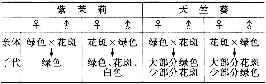 1908年,柯伦斯(Correns)发现,紫茉莉中有一种花斑植株,由绿色、白色和花斑三种枝条组成。他以3种枝条分别做母本和父本进行杂交,得到的结果见表1。根据这一结果,推测到紫茉莉枝条的颜色与细胞质中的质体分配有关。此后,又分别在藏报春、月见草等20多种植物中发现类似现象,表明叶绿体的遗传是通过母本传递的。1943年罗兹(M.M.Rhoades)在研究玉米埃型条纹叶的遗传现象时,发现核基因对叶绿体遗传具有控制作用。1962年,里斯(H.Ris)和普劳特(W.Plaut)通过电子显微镜和细胞化学的方法,证明衣藻(Chlamydomonas moewusii)的叶绿体中含DNA(脱氧核糖核酸)。以后有多人的实验证实叶绿体DNA同核DNA一样具有连续性、自主性的遗传物质。从1954年美国学者塞杰(Sager)取得抗链霉素突变型开始到1967年间,先后用人工诱变的方法获得了上百个突变体,利用这些突变体进行大量杂交,通过对基因的分离和重组的研究并结合纯合分析,对叶绿体基因进行了定位。此外,还结合运用分子杂交技术绘出了叶绿体部分基因的遗传学图。70年代博索恩(Boasson)等人分别在烟草、菠萝等植物的幼叶上观察了叶绿体依靠自身分裂增加数目的过程,发现光照条件是限制叶绿体复制数量的重要因素,并观察到叶绿体在细胞繁殖时是随机而不平均地分配到子细胞中去的。至此,叶绿体复杂的遗传机理被逐渐揭示出来。
