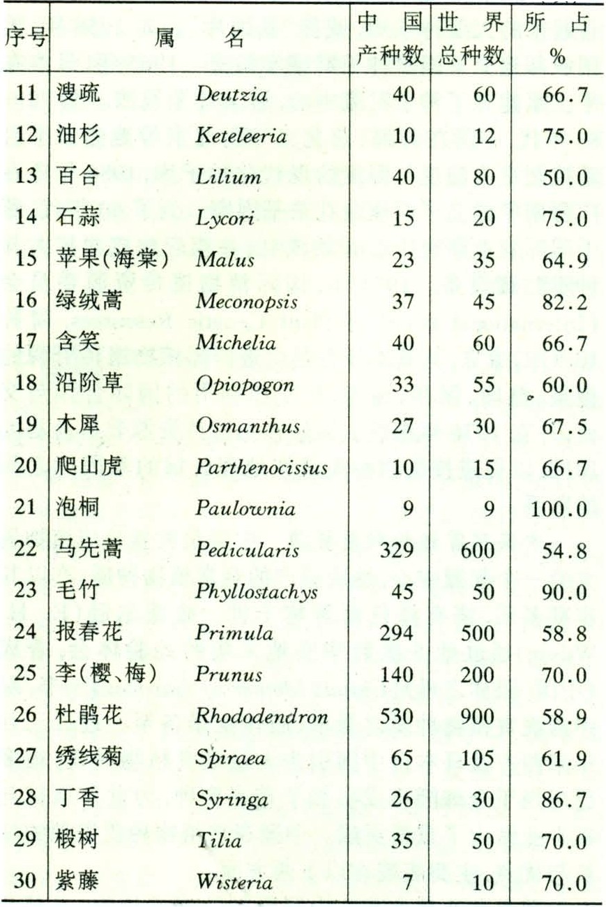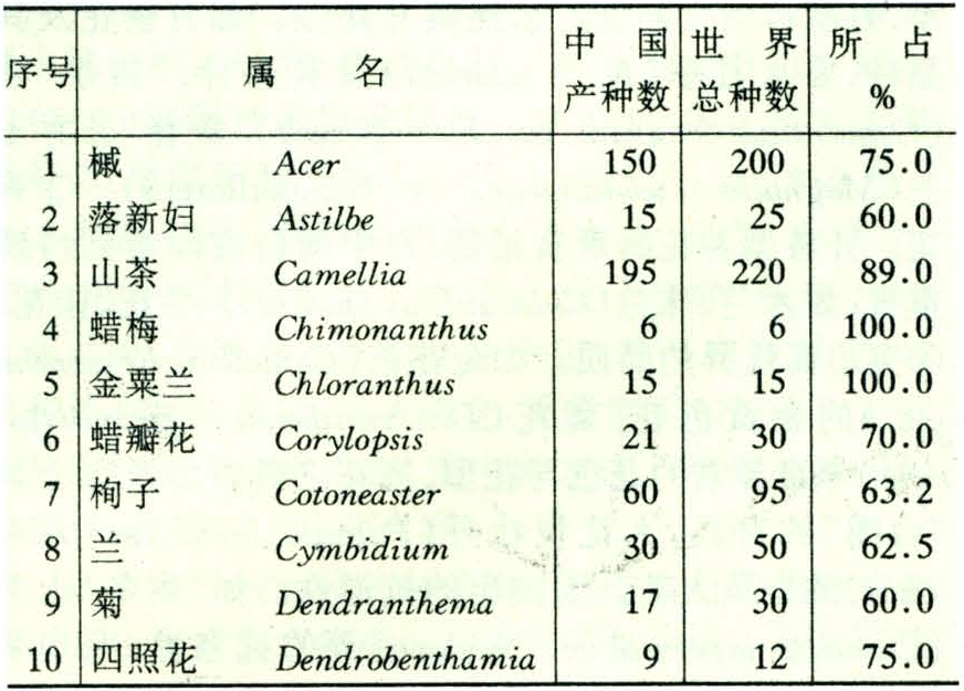 中国原产的观赏植物,尤其是适合园林或家庭栽培应用的花卉以及有潜在发展能力的观赏植物种质,在全球所占比重甚大。如乔、灌木中国原产者,为数多达7500种以上,松柏类、竹类尤为突出,这在世界上是罕见的。草本观赏植物种质也十分丰富,有的还是举世无双的特产。在某些科、属中,中国更是世界分布中心和种类最多者或全部特产种之唯一故乡(见表)。