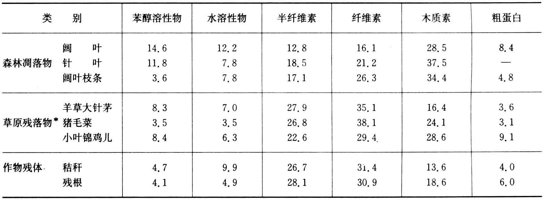 在自然植被下,植物残体主要是木本植物凋落物的叶片、枝条、花果和死亡的根以及草本植物的立枯和死亡的根;在耕地土壤中,主要是作物的落花、落叶以及收获后残留的根茬和部分秸秆。植物残体的种类不同,其化学组成也不尽相同。木质素的含量依次为:森林凋落物>草原残落物>作物残体;碳水化合物的含量依次为:作物残体>草原残落物>森林凋落物。后者中针叶林凋落物的碳水化合物和木质素含量较阔叶林凋落物的为高,苯醇溶性物则较阔叶林的为低。作物残体中其地下部的木质素含量高于其地上部的木质素含量(表1)。动物残体包括各种土壤动物及禽、兽的尸体。其化学组成与植物残体迥异。例如蚯蚓躯体的蛋白质含量以干重计高达62.6%,粗脂肪为8.2%,碳水化合物仅为11.8%。